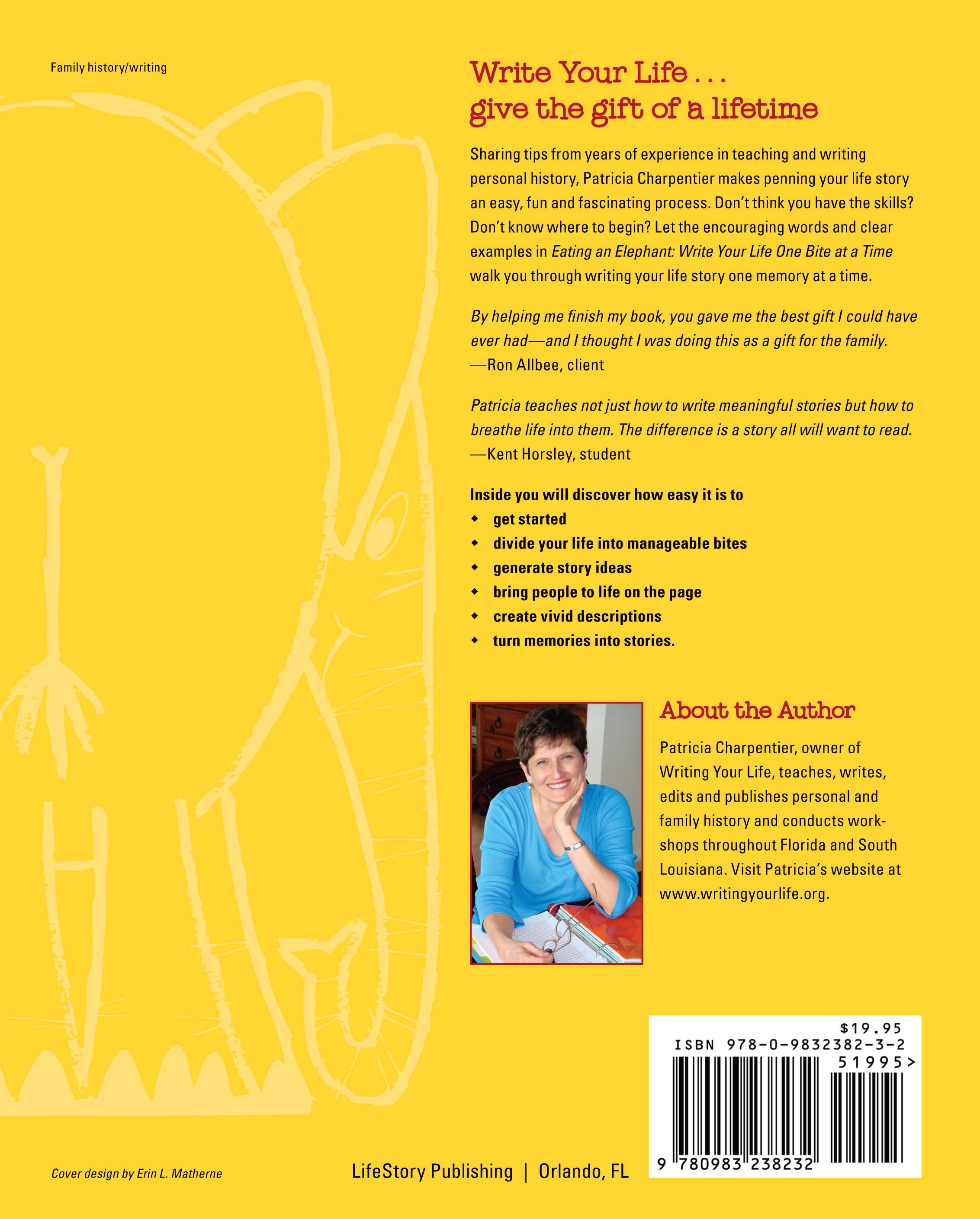 Patricia Charpentier, author of the multi-award winning book, Eating an Elephant: Write Your Life One Bite at a Time, teaches, writes, edits, ghostwrites, and publishes personal and family history. She is a popular speaker who, since 1999, has helped hundreds of people write the most important stories of their lives. Patricia offers live workshops and ongoing courses, including programs that utilize videos, one-on-one coaching, group Q&A calls, and more to help people succeed in writing the story of a lifetime. Patricia has coauthored, edited, and published more than thirty-five family histories. She lives in Orlando with her golf-loving husband Bob and enjoys to dance for exercise although she is grateful the motto of the studio is there are no mistakes, only solos. Visit Patricia at www.writingyourlife.org.